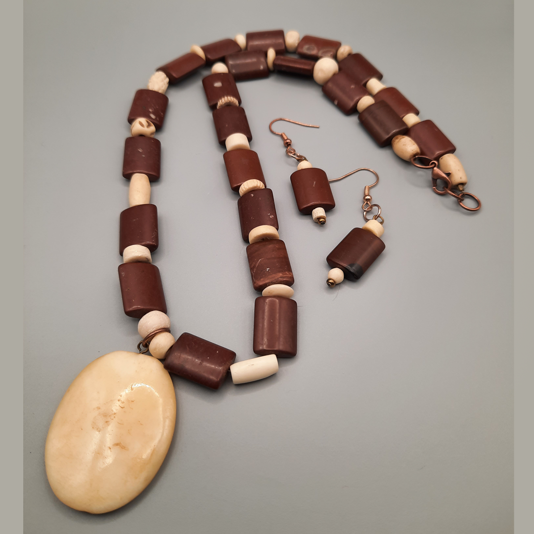 Red jasper and wood beads with a natural bone focusĀ Necklace and earring set.